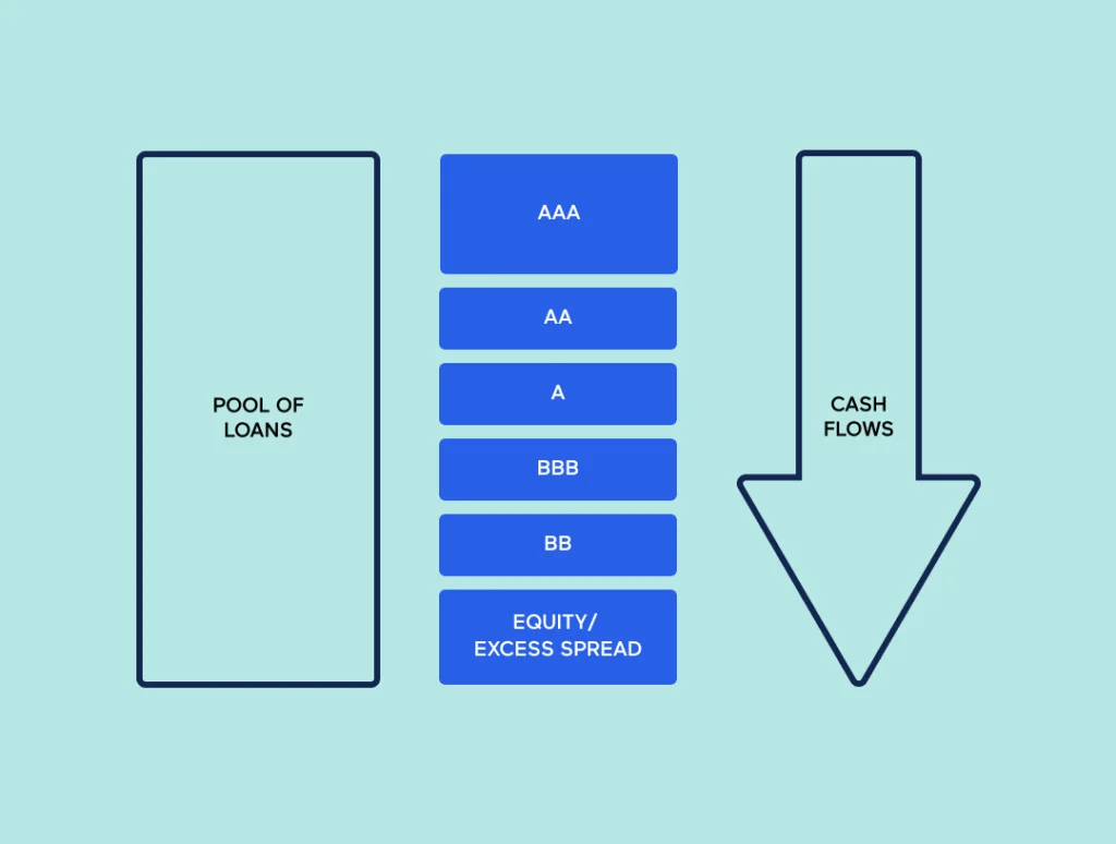 The different tranches carry different levels of risk and cashflows with the equity tranche carrying the highest risk. Equity payouts are based upon the remaining cashflows – or excess spread – once the obligations for all debt tranches have been met.